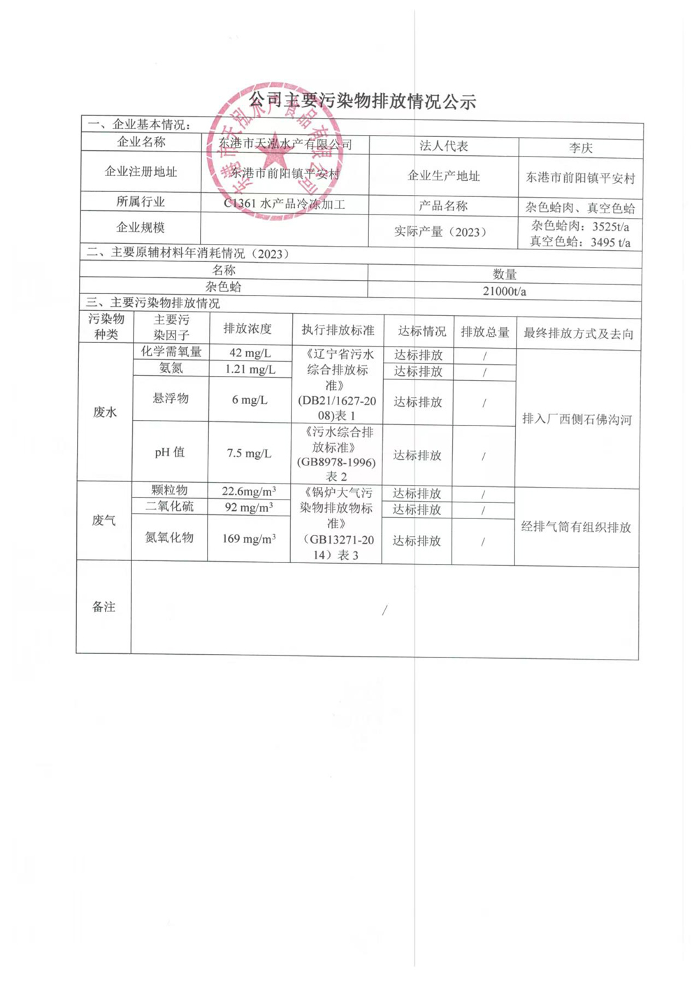 東港市天泓水產(chǎn)有限公司主要污染物排放情況公示